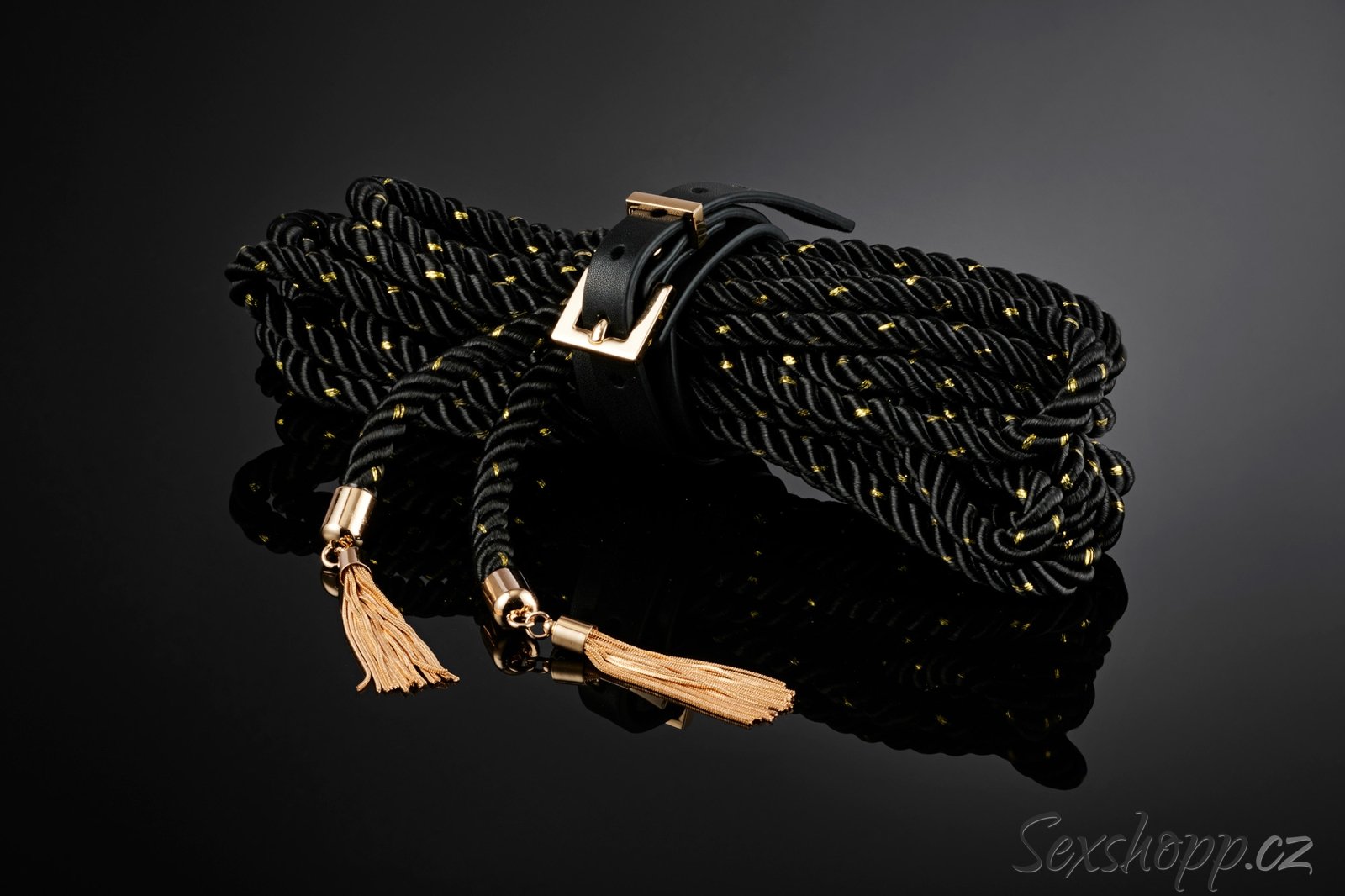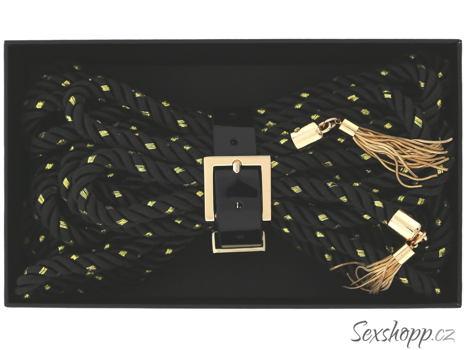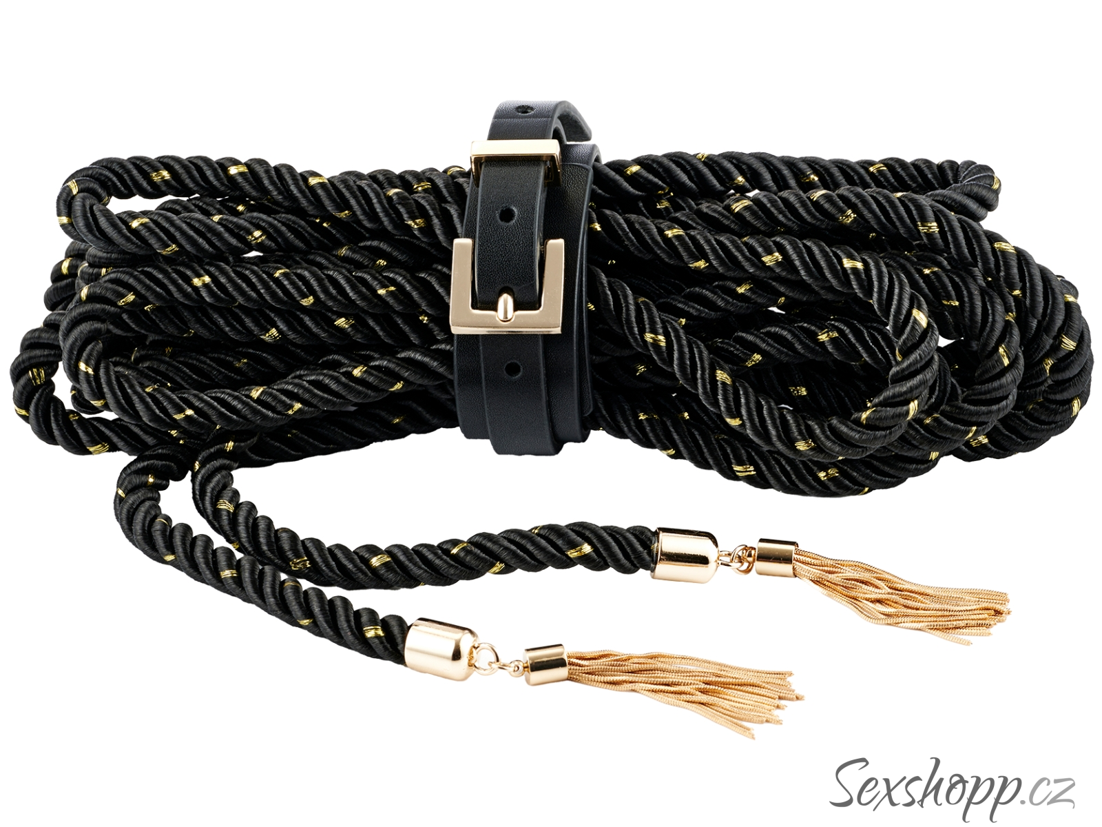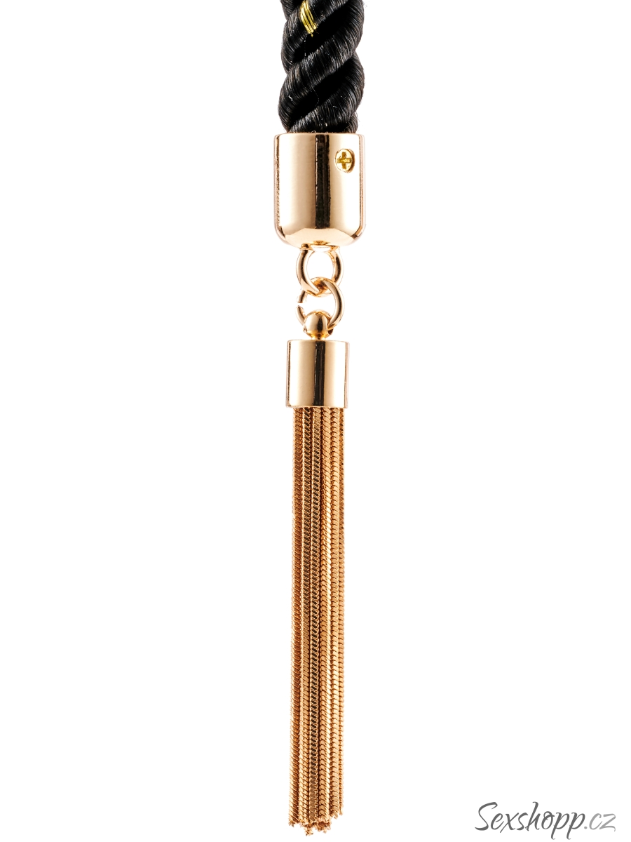 Lano má konce ozdobené zlatými střapci a dostanete k němu i řemínek s přezkou pro snadné uložení. Je měkké, pružné a příjemné na dotek – hodí se i na delší hry.