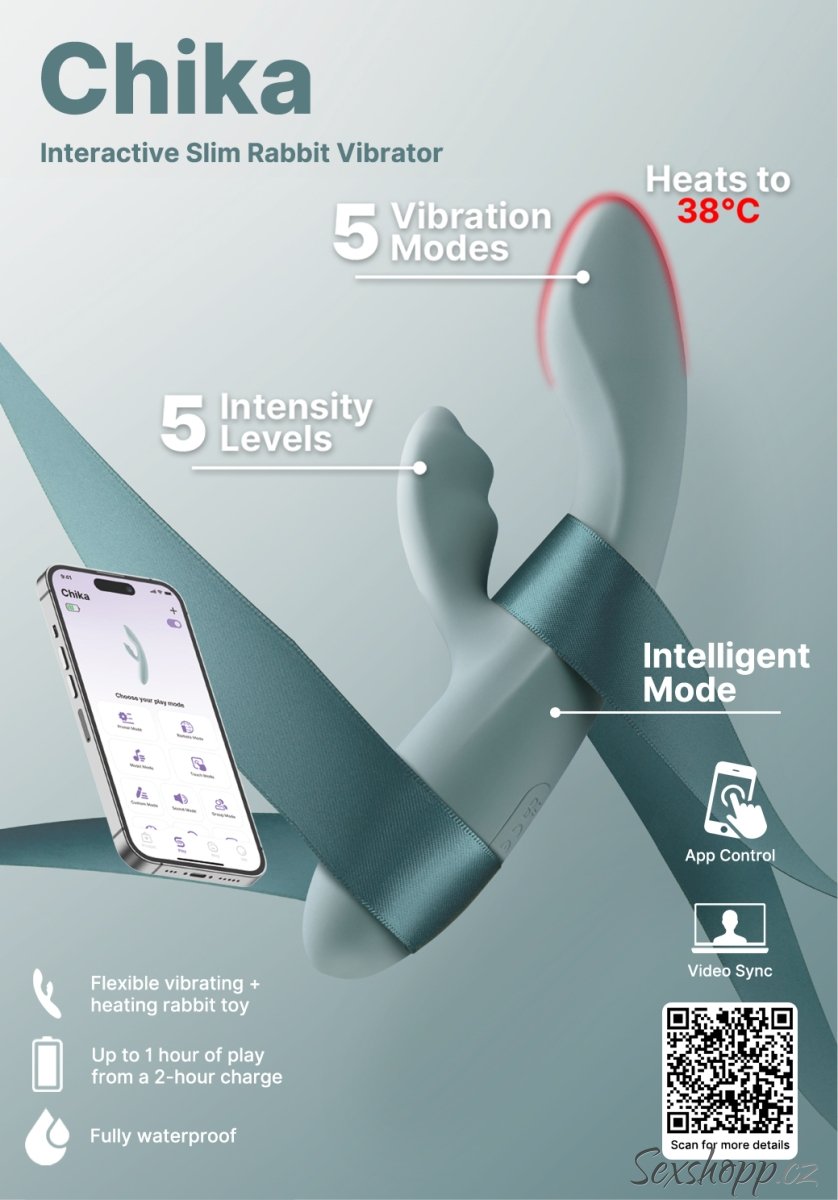 Vibrátor s králíčkem Chika stimuluje bod G a klitoris najednou, zahřeje se až na 38 °C a lze jej ovládat mobilem.