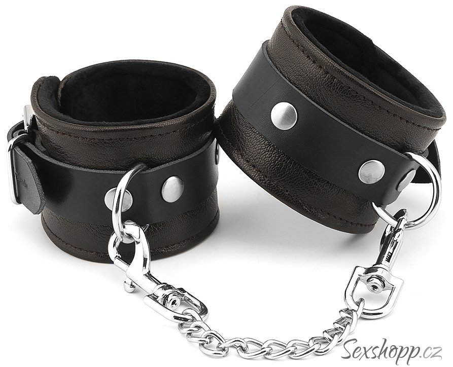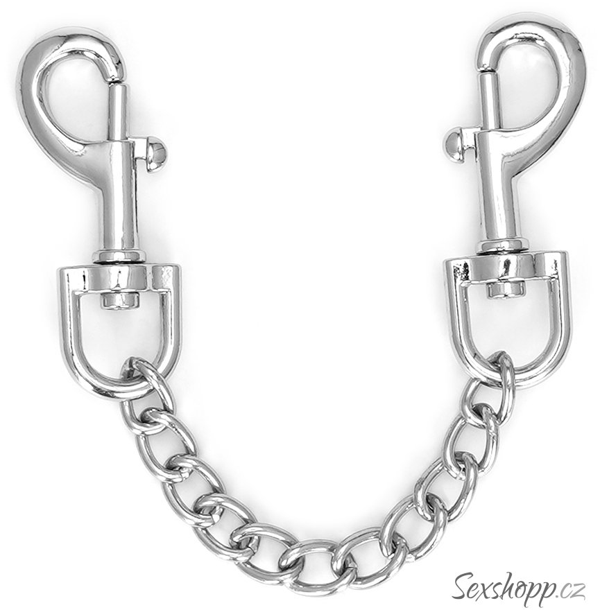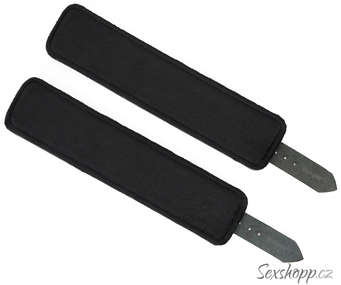 Mají zapínání na kovovou přezku a jsou spojená kovovým řetízkem s karabinkami. Více