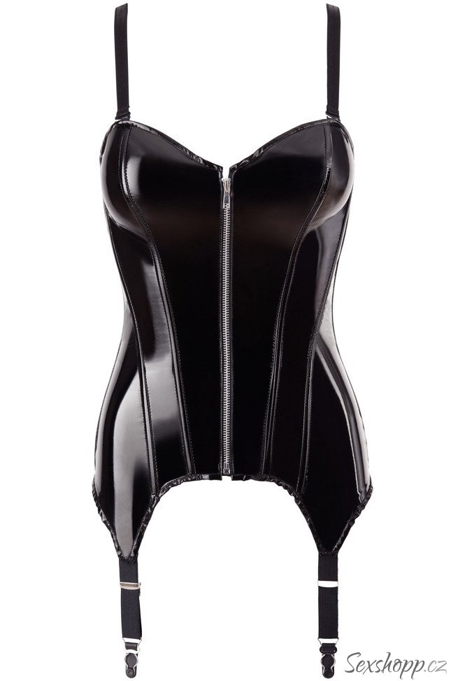 Lakovaný korzet se zipem, šněrováním, podvazky a odnímatelnými ramínky
