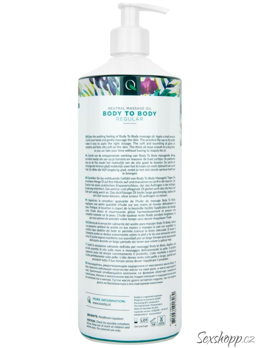 Olej Body To Body je ideální pro relaxační masáže. Je hedvábně hebký, umožňuje hladké klouzání rukou po těle, vydrží dlouho kluzký a je hustější než jiné oleje.