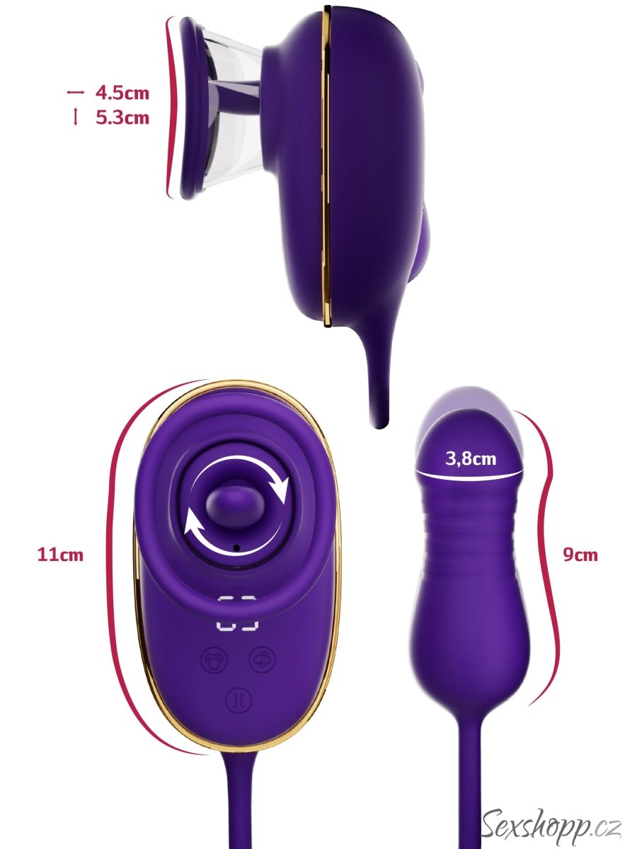Stimulátor potěší klitoris vibracemi, sáním a rotačním jazýčkem, zatímco zadeček si užije kombinaci přírazů a vibrací.