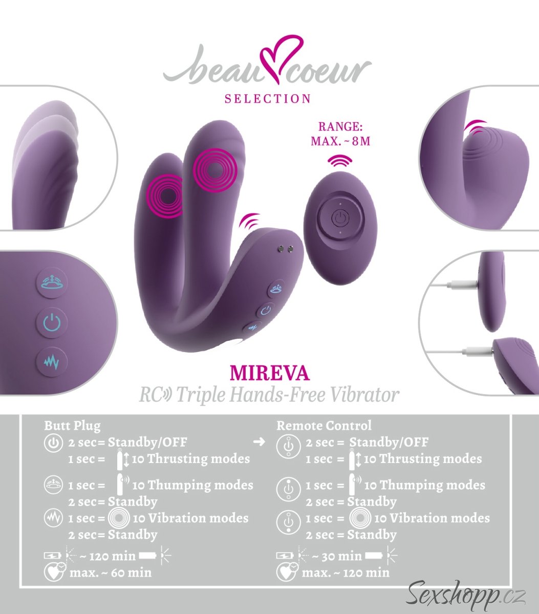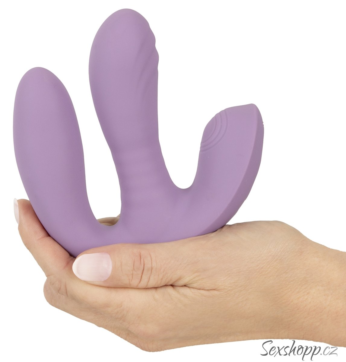 Vibrátor potěší vaginu, klitoris a konečník najednou, a to různými druhy stimulace. Vaginální rameno přiráží, anální část vibruje a rameno pro stimulaci klitorisu pulzuje.