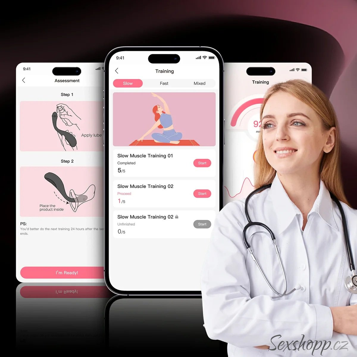 V mobilní aplikaci najdete tréninkové programy sestavené odborníky. Po připojení činky k aplikaci nejprve pomocí snímačů tlaku a nafukování zjistíte přesnou sílu pánevních svalů a podle toho snadno přizpůsobíte tréninkový program svým potřebám tak, aby bylo posilování co nejvíce efektivní.