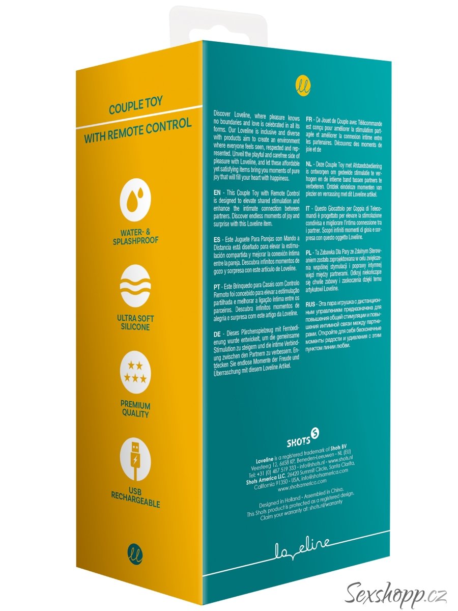 Párový vibrátor Loveline potěší při sexu silnými a hlubokými vibracemi oba dva v páru. Pro pohodlnější zážitek ho můžete ovládat dálkovým ovladačem.
