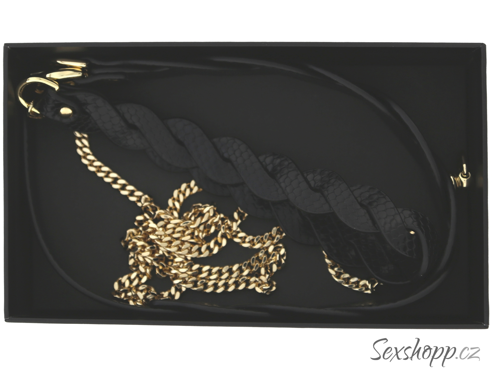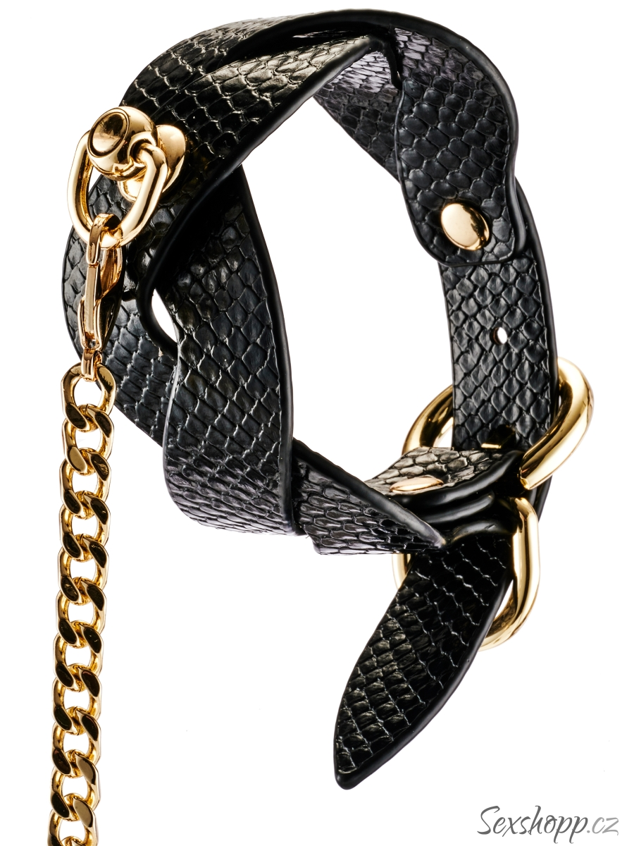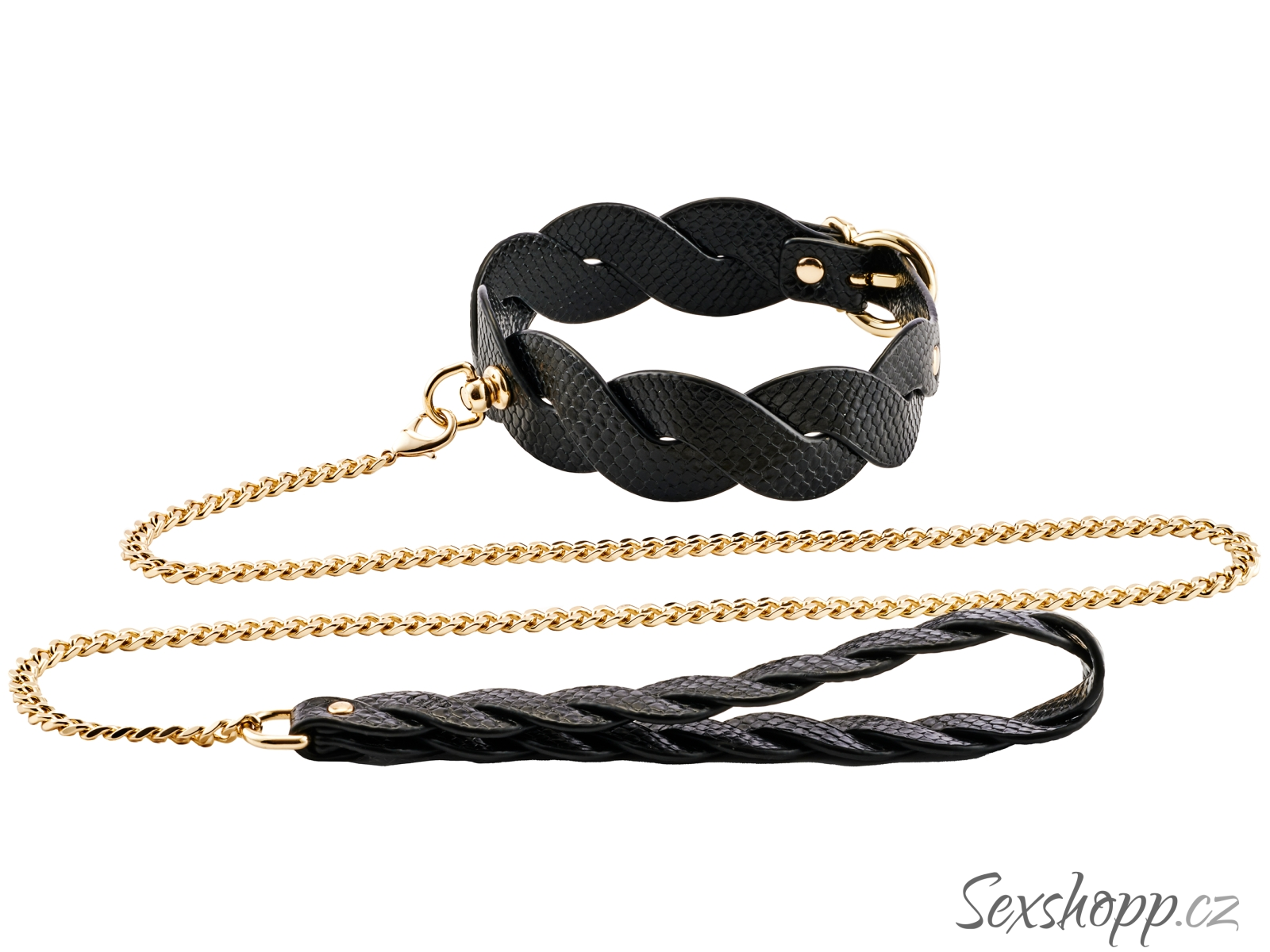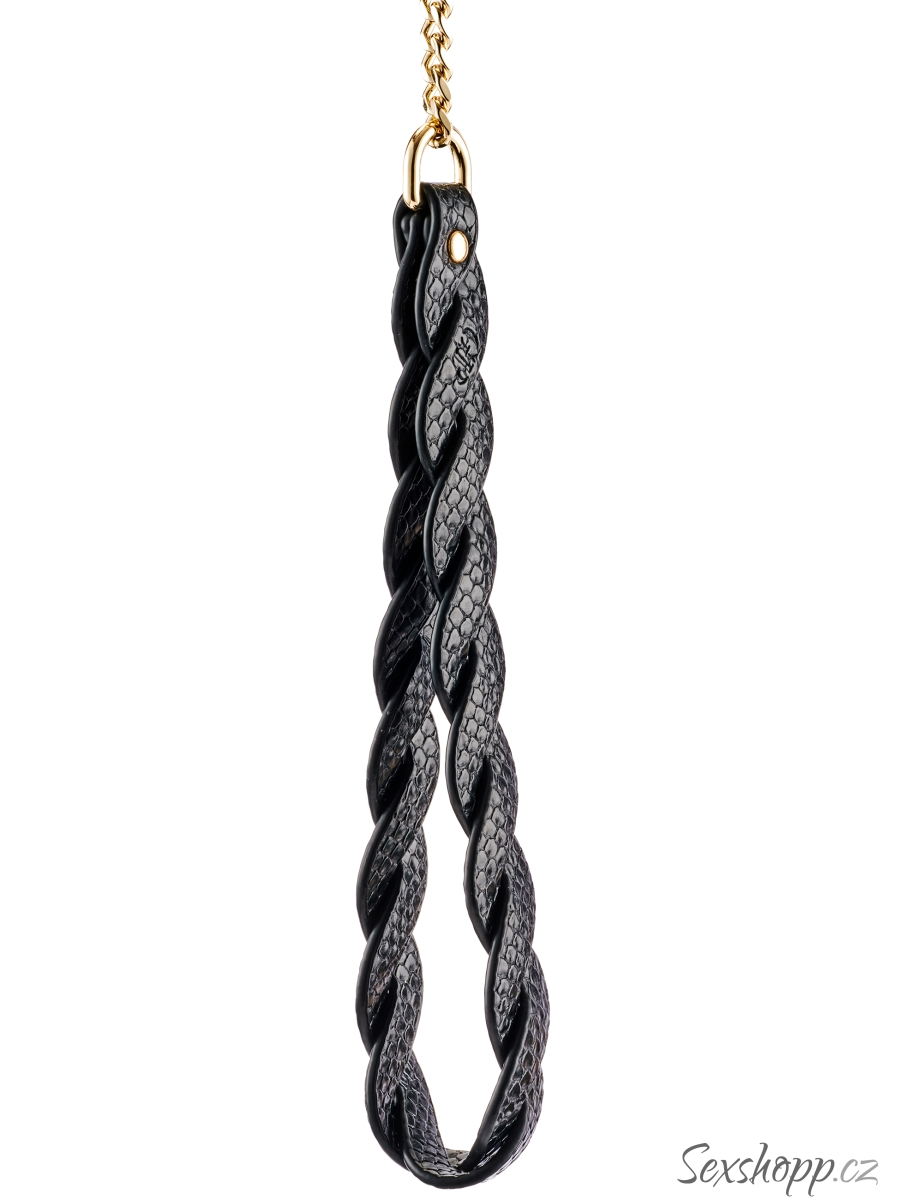 Obojek má pletený texturovaný design a zlaté detaily – poslouží jako elegantní pomůcka pro něžné a stylové BDSM hry.