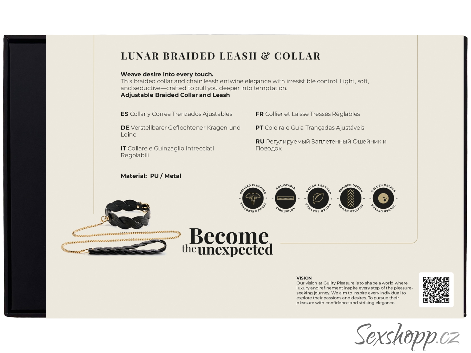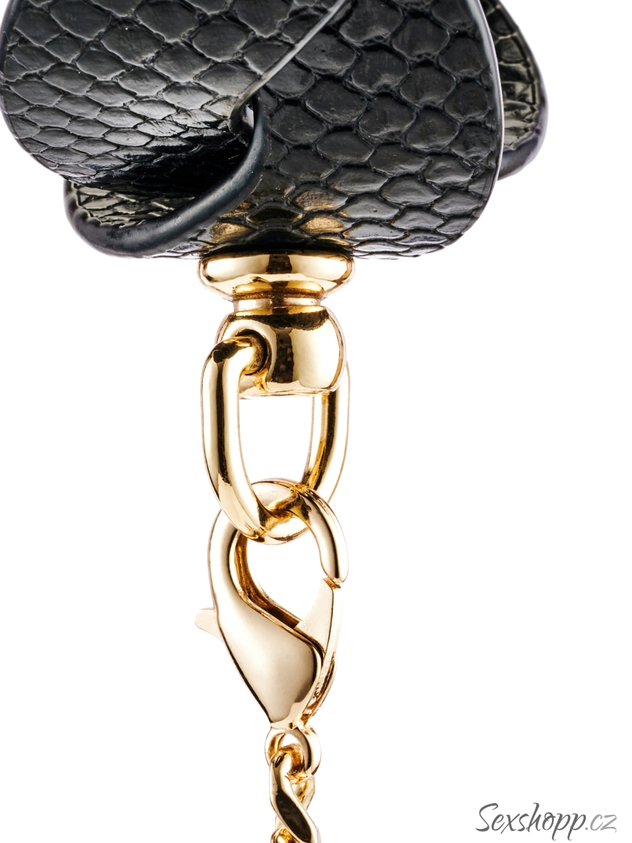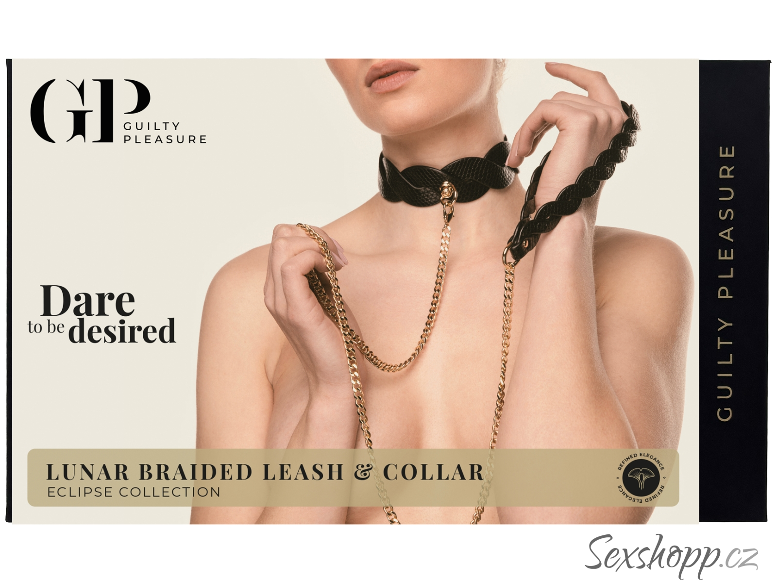 Obojek má pletený texturovaný design a zlaté detaily – poslouží jako elegantní pomůcka pro něžné a stylové BDSM hry.