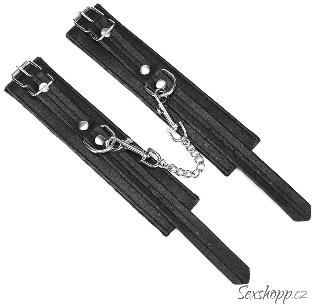 Mají zapínání na kovovou přezku a jsou spojená kovovým řetízkem s karabinkami. Více