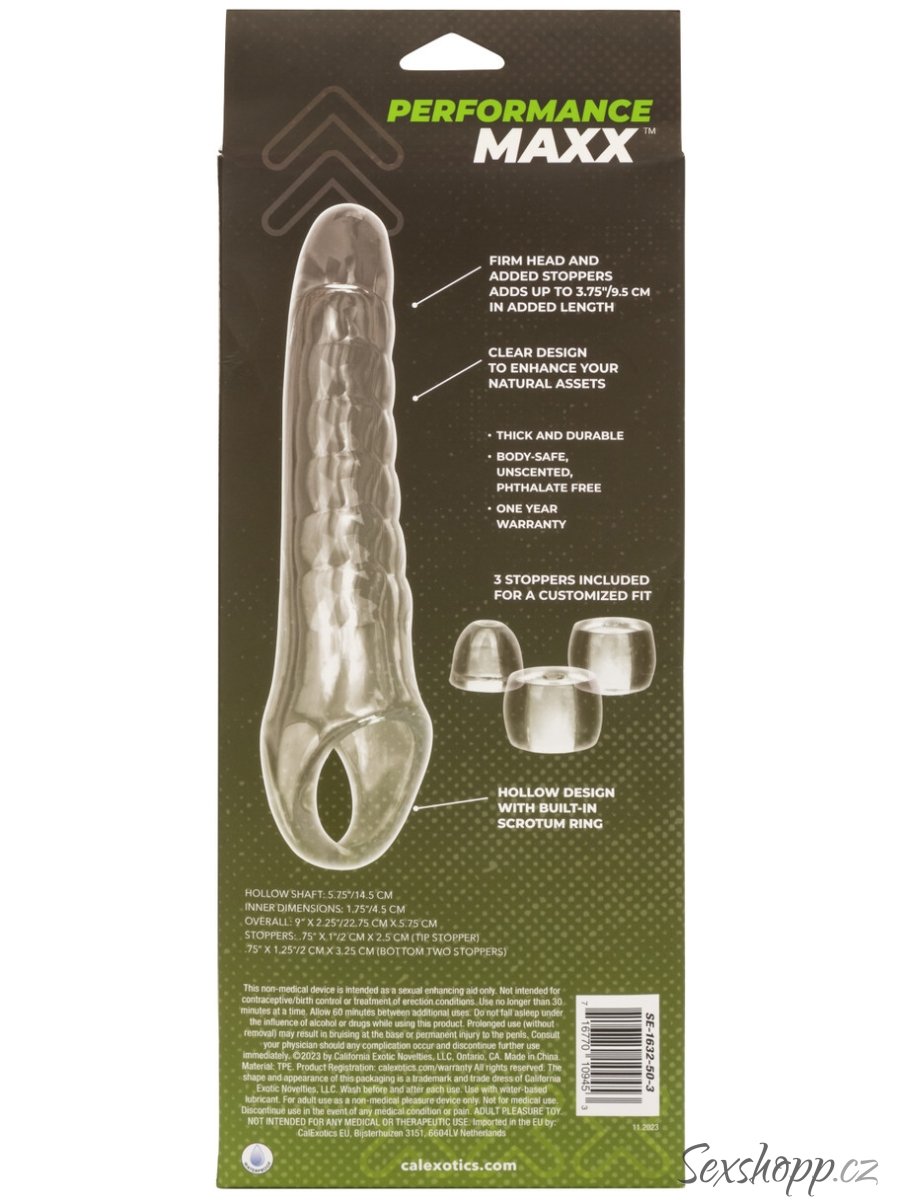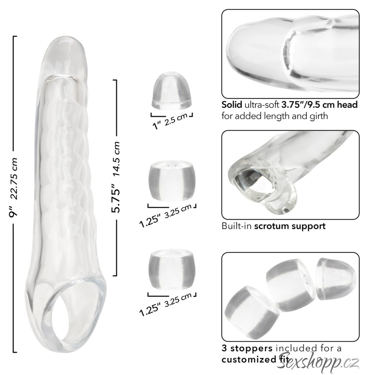 Návlek zvětší průměr penisu a přidá až 9,5 cm do délky. V balení najdete 3 zátky, pomocí kterých přizpůsobíte vnitřní délku návleku.