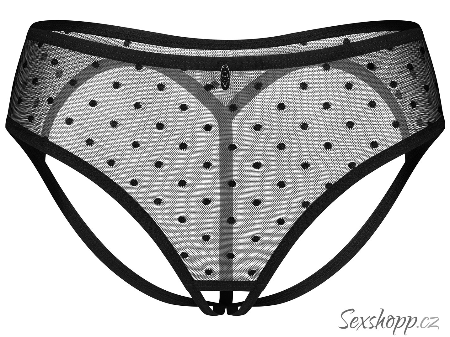 Kalhotky jsou ušity z měkké a elastické průsvitné látky s puntíky, která se pohodlně nosí. Zadní část kalhotek je otevřená a odhaluje hýždě a otevřený rozkrok zase přímo vybízí k mazlení klína. Více