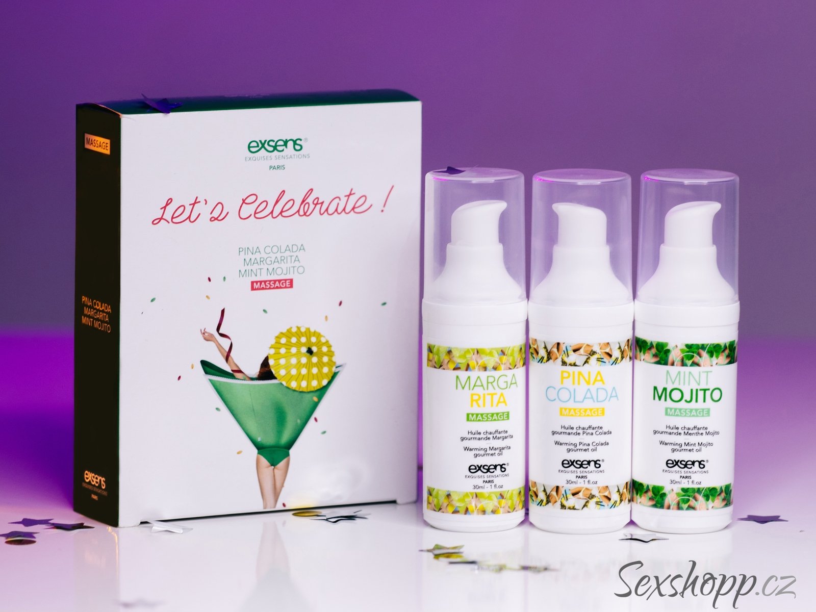 Sada obsahuje 3 oleje s příchutí známých koktejlů (Piña Colada, Margarita a Mint Mojito). Oleje jsou jedlé a mají hřejivý efekt, který zesílí při kontaktu úst s pokožkou.
