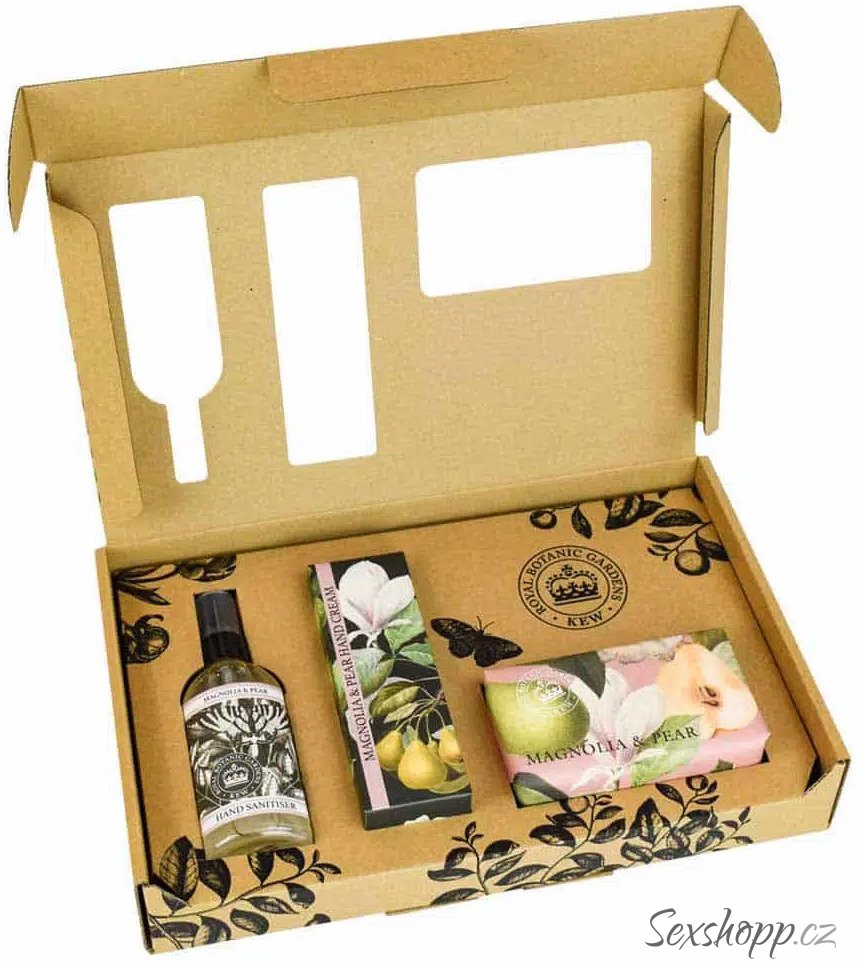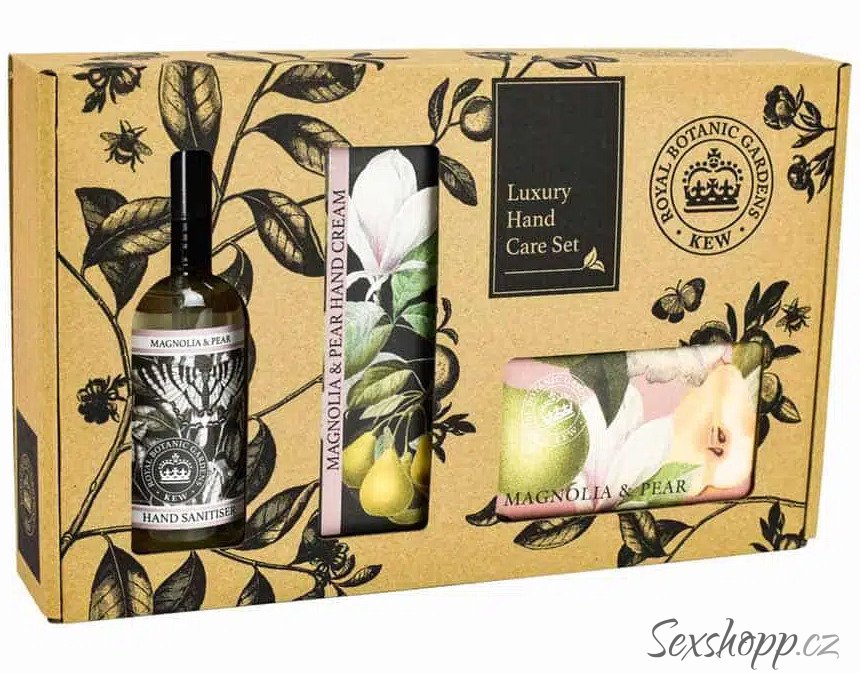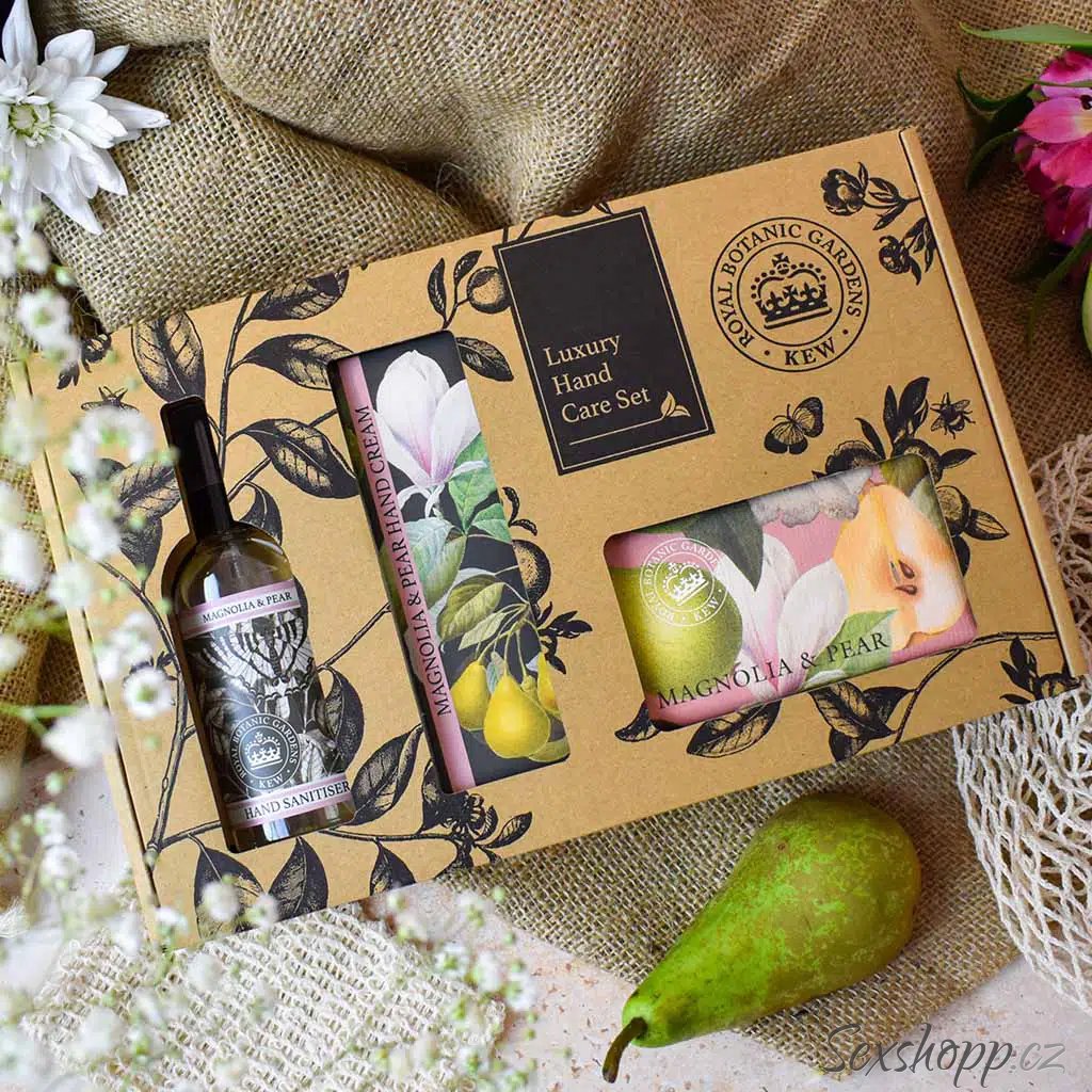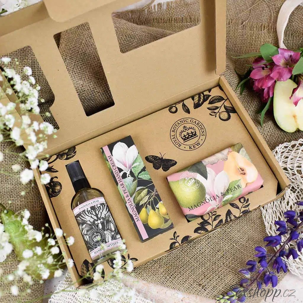 Hýčkejte své ruce nebo dopřejte luxusní péči někomu výjimečnému ve svém životě. Sada pro péči o ruce Magnolia & Pear od English Soap Company obsahuje tuhé mýdlo, krém na ruce a dezinfekční sprej.