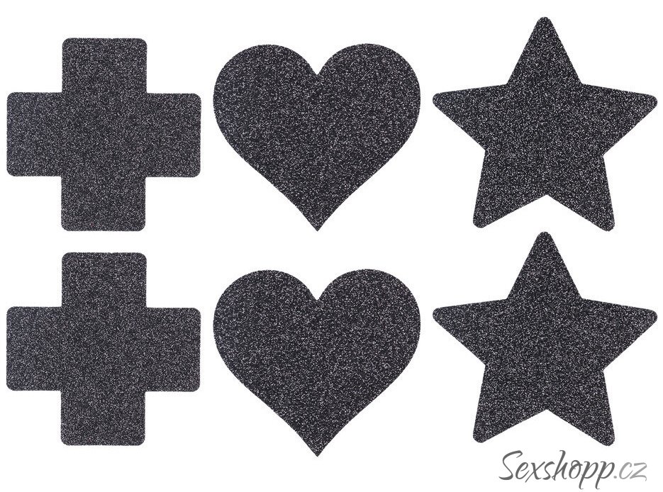 V sadě najdete 3 páry černých samolepek – ve tvaru X, srdce a hvězd. Ozdobí nahé tělo a skvěle se hodí i k erotickému oblečení.