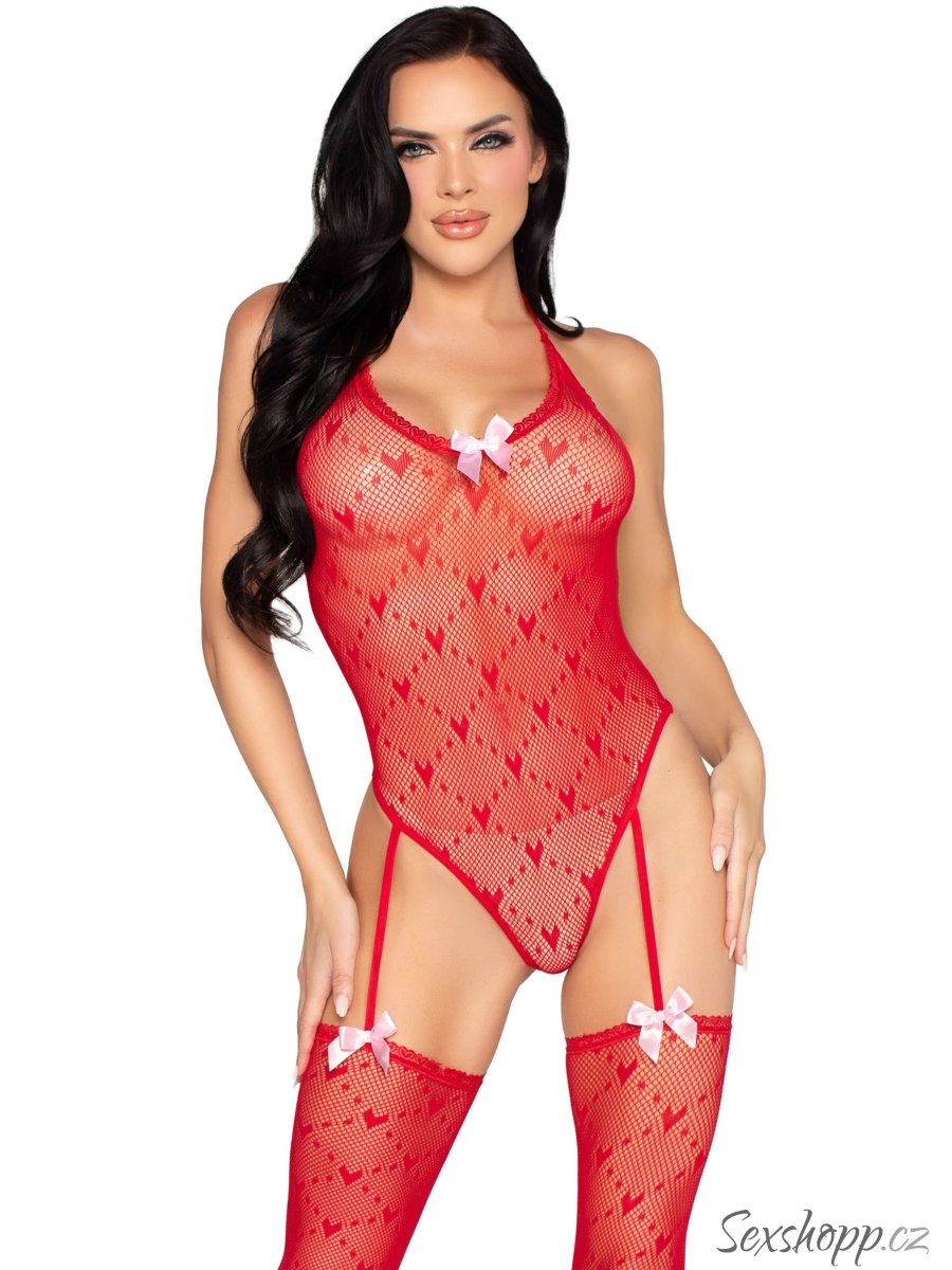 Body je ušito z měkké a velmi pružné síťoviny s puntíky a srdíčky. Punčochy jsou k body připevněny napevno pomocí podvazkových pásků.