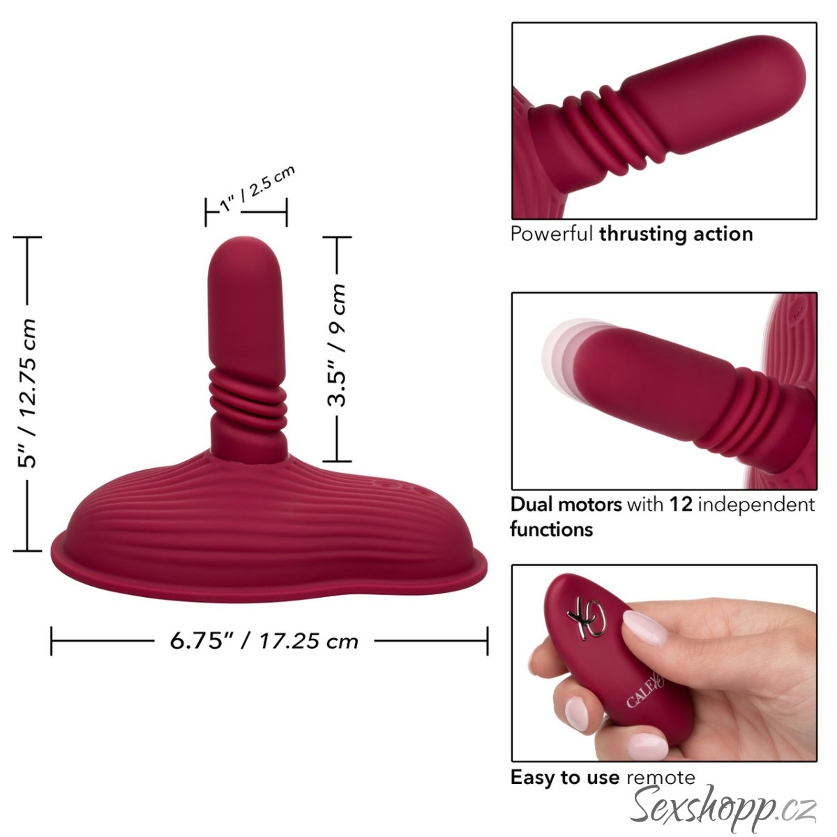 Celkem si můžete vybrat ze 3 rychlostí přírazů a 12 vibračních programů (vibruje celé sedátko). Vibrace a přírazy lze ovládat samostatnými tlačítky, takže si namixujete vlastní koktejl potěšení. Díky paměťovému čipu pak nemusíte složitě hledat svoji oblíbenou kombinaci.
