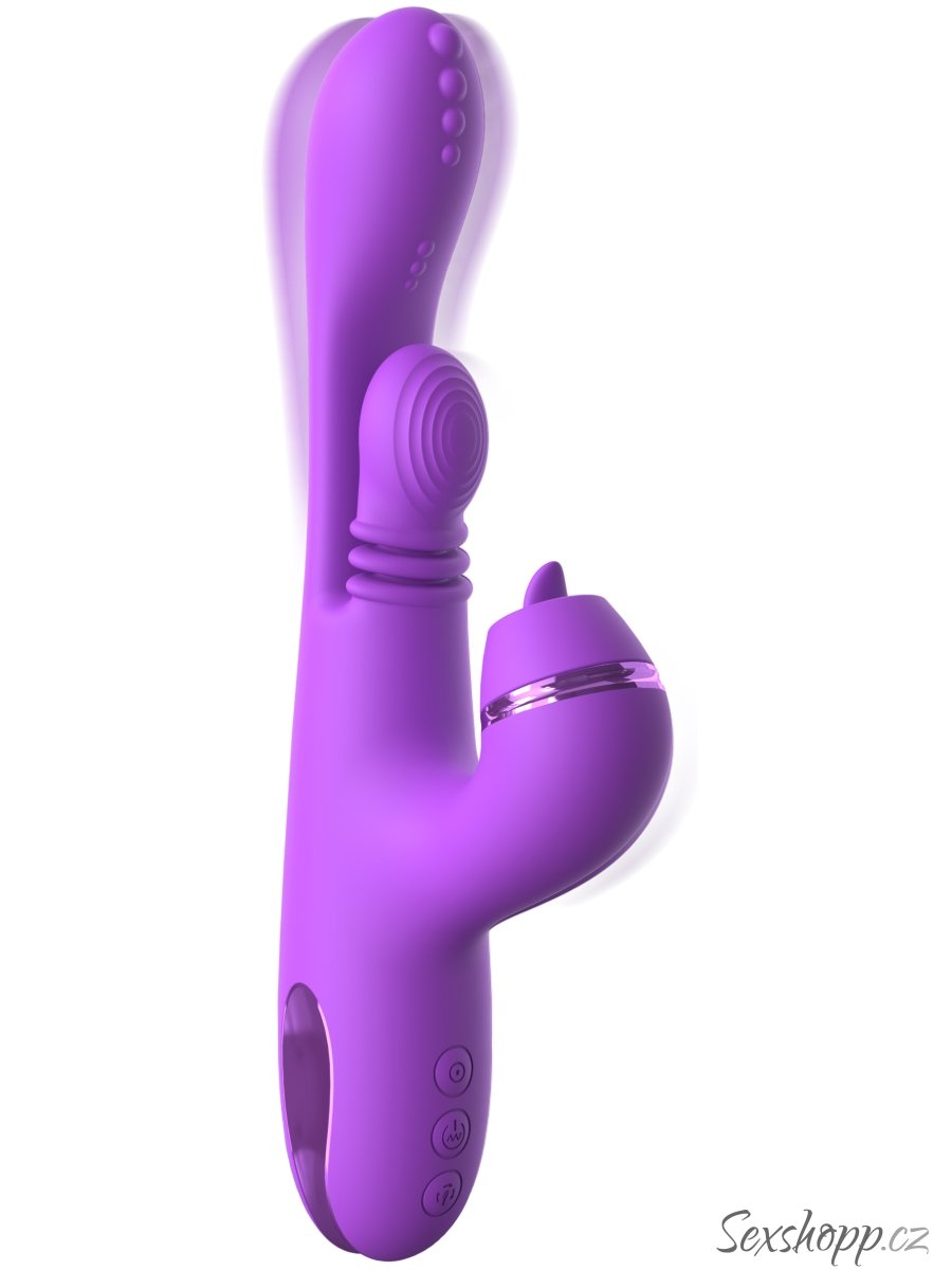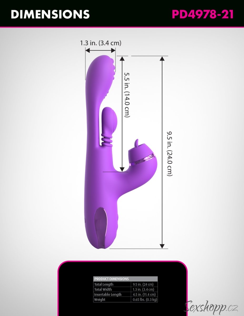 Má celkem 4 motorky, přičemž vibrace, masážní pohyb a králíčka můžete ovládat samostatnými tlačítky – namícháte si koktejl potěšení přesně podle chuti. U každé funkce si vyberete z 10 stimulačních módů.