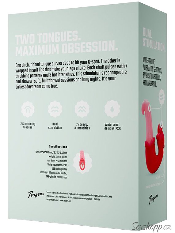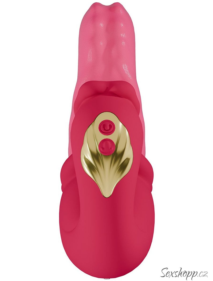 Oba motorky ovládáte samostatnými tlačítky pro snadné přizpůsobení stimulace. Velký jazyk má ohebnou špičku pro větší pohodlí během hraní a žebrovaný povrch pro extra potěšení.